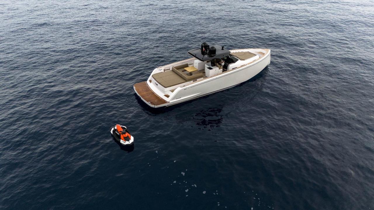 The white hull, paired with taupe upholstery and a fully customized cabin layout, reflects Pardo’s dedication to contemporary elegance and high-end finishes. Designed for discerning owners, this unit features full air conditioning, dual GPS screens, radar, autopilot, VHF, night vision FLIR camera, searchlight, bow thruster, Volvo interceptor system with Auto Trim and DPS for enhanced control and stability in all conditions.