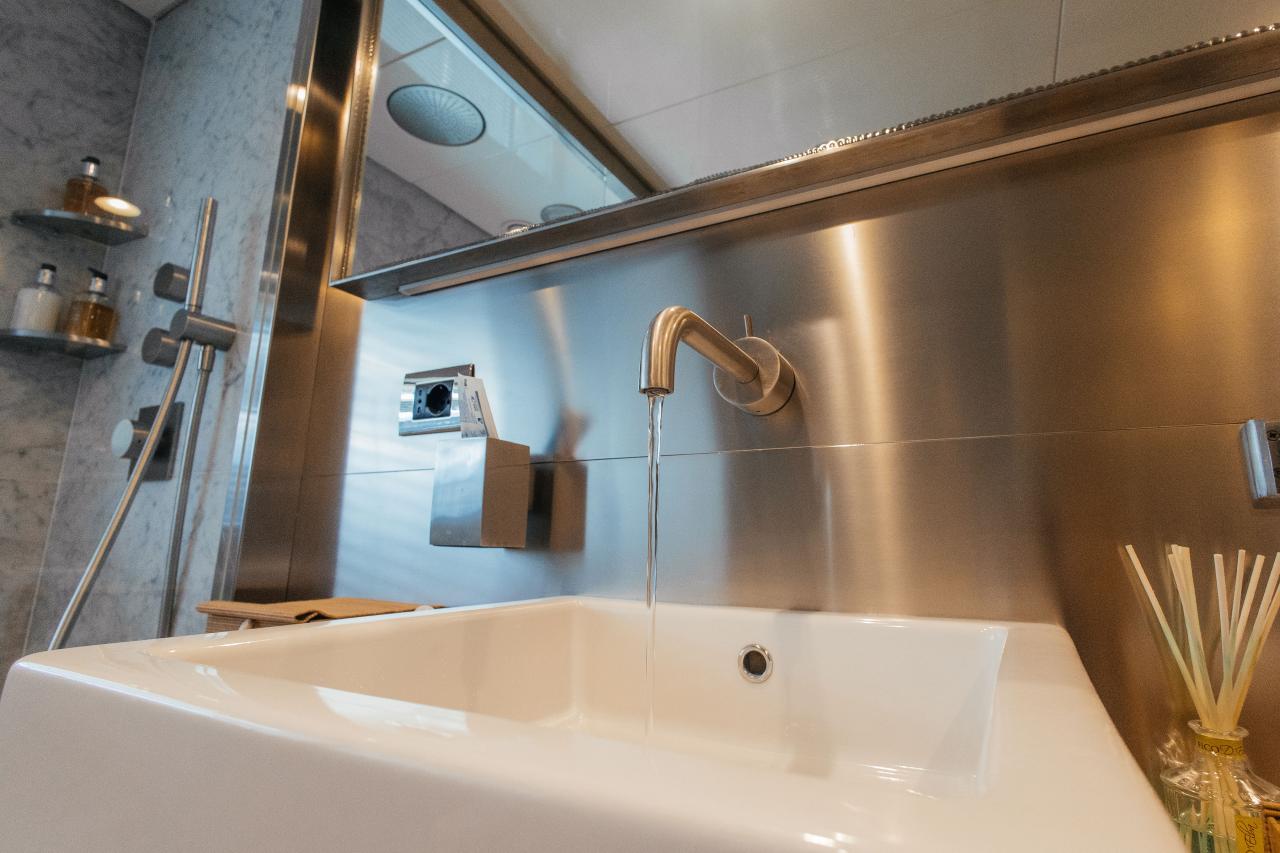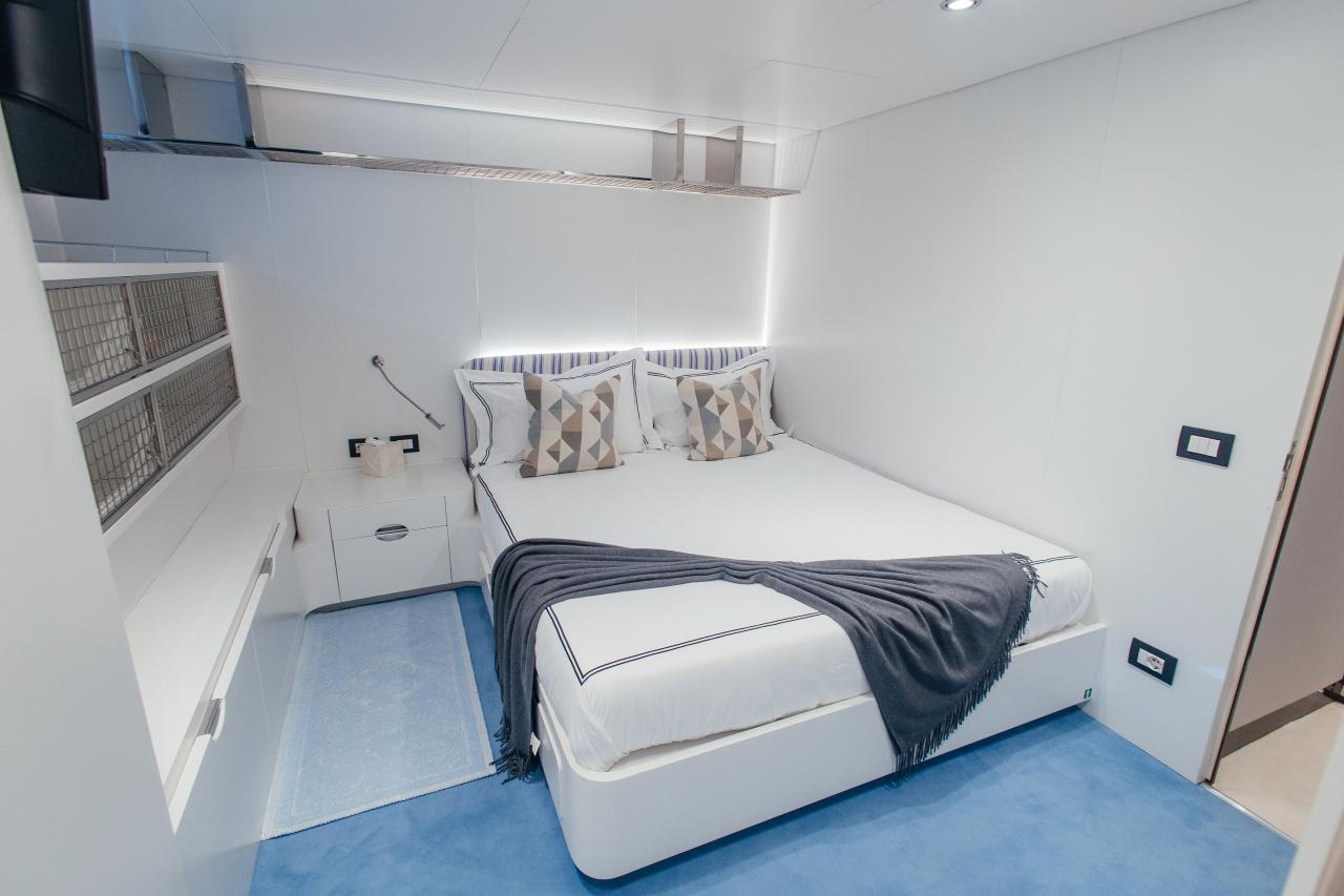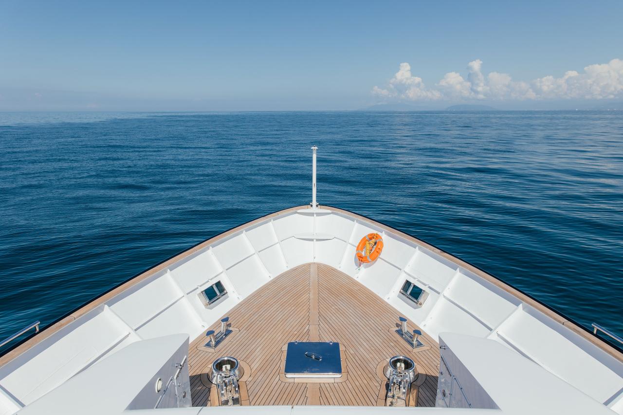 Powered by twin Caterpillar engines and equipped with new 70 kW Kohler generators, she cruises efficiently at 12 knots with a maximum speed of 15 knots and a range of 2,300 nautical miles. Her full-displacement hull, stabilizers at anchor, and renewed technical systems guarantee quiet, vibration-free comfort in all conditions