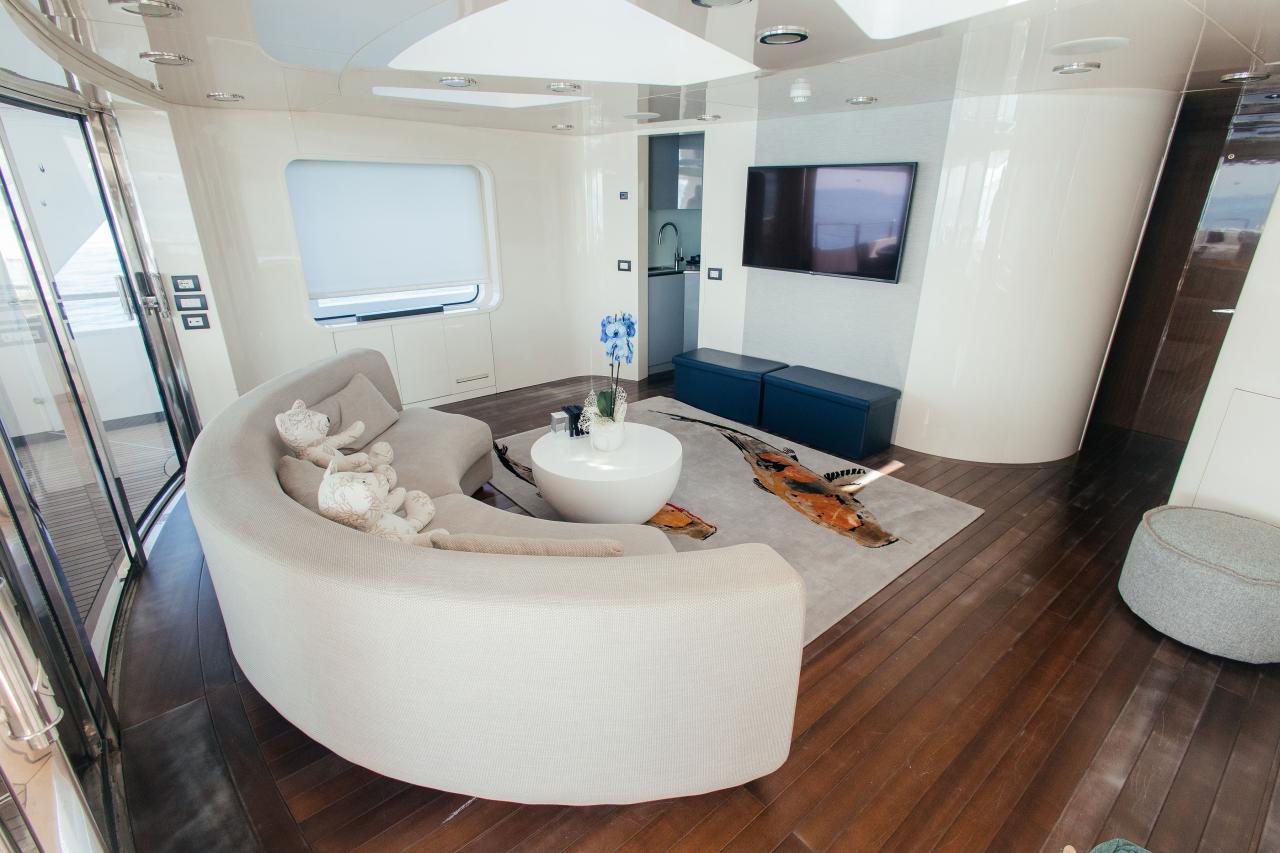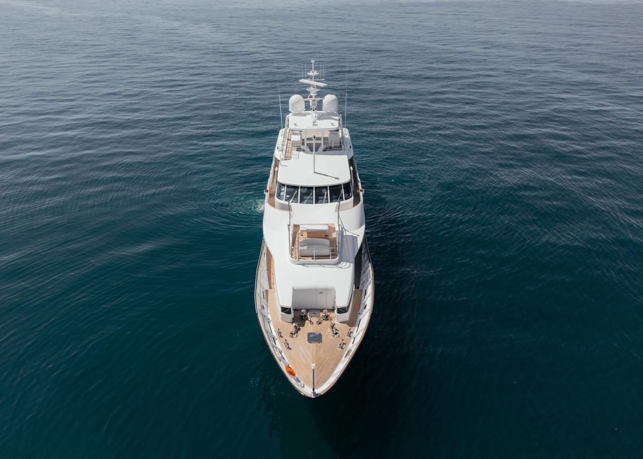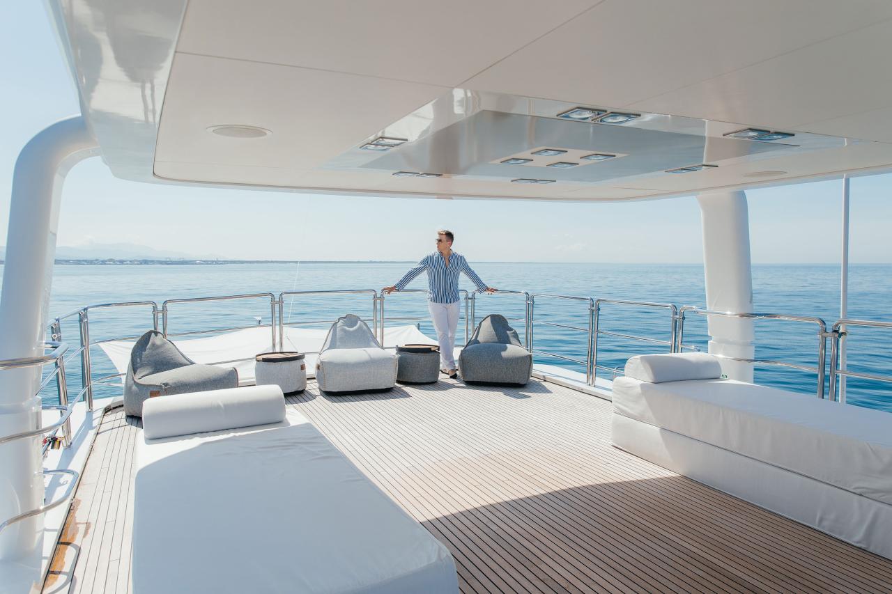 Her elegant interiors, redesigned by Dada & Associates, blend warm woods and refined textures with a modern Mediterranean flair. Expansive decks create a seamless flow between indoor and outdoor living, offering multiple social areas across all levels – from the generous aft deck to the sun-filled upper terrace complete with dining for ten, a bar, and a large sunlounge.