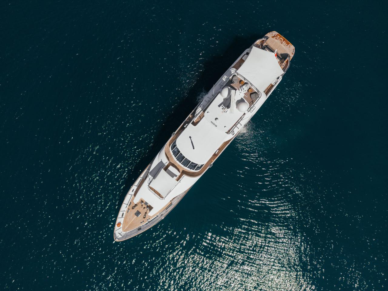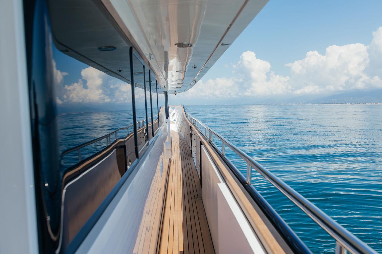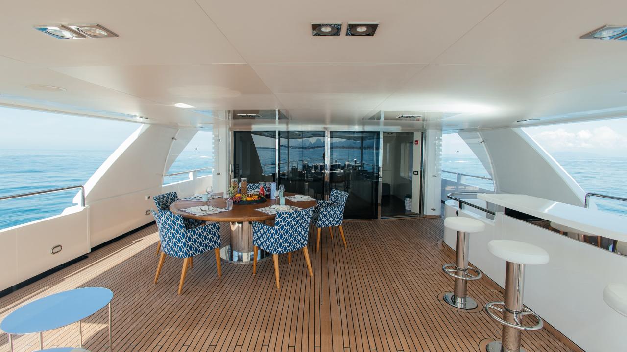 Her elegant interiors, redesigned by Dada & Associates, blend warm woods and refined textures with a modern Mediterranean flair. Expansive decks create a seamless flow between indoor and outdoor living, offering multiple social areas across all levels – from the generous aft deck to the sun-filled upper terrace complete with dining for ten, a bar, and a large sunlounge.
