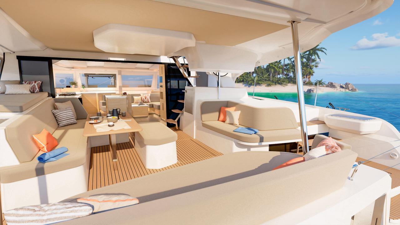 Outside, you simply choose your favorite place to relax in the sun: an aft daybed facing the horizon, wide cockpit benches, or the large sunbeds at the front. For those who love elevated views, the flybridge offers seating and sunbathing areas that are especially enjoyable while sailing.