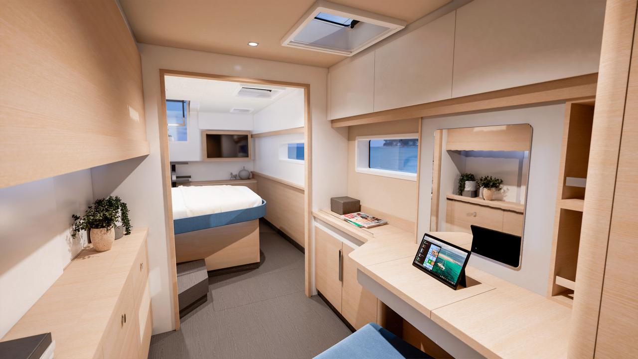 The Maestro version offers large, bright living spaces and the possibility to personalize the cabin with a low cabinet or a desk, as well as a forward compartment that can be configured as a large bathroom, a baby cabin, or a workshop.