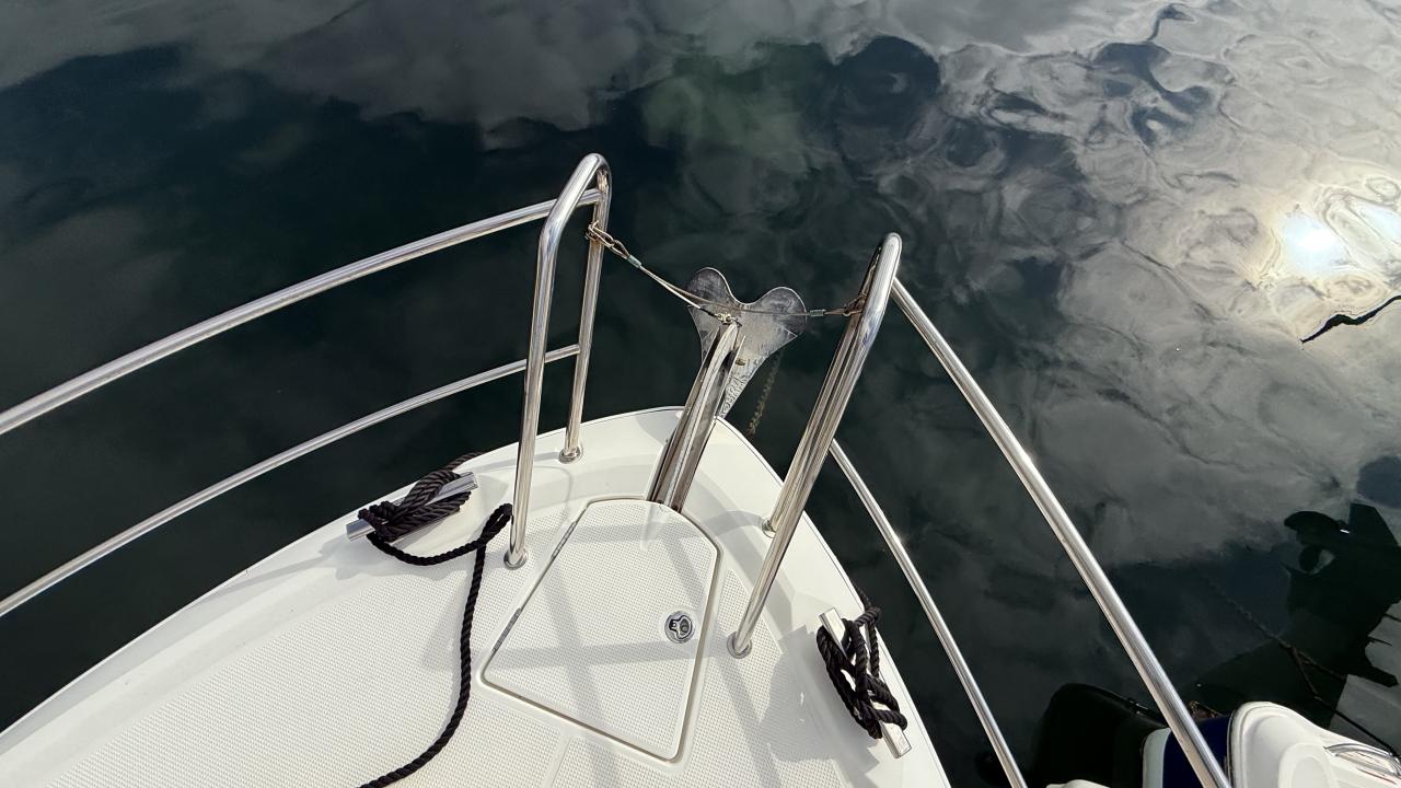 Navigation equipment includes GPS/chartplotter, depth sounder, VHF, compass and bow thruster. Comfort features comprise an electric windlass, deck shower, sun awning, protection covers and audio system. The galley area is equipped with a refrigerator, sink and interior lighting.