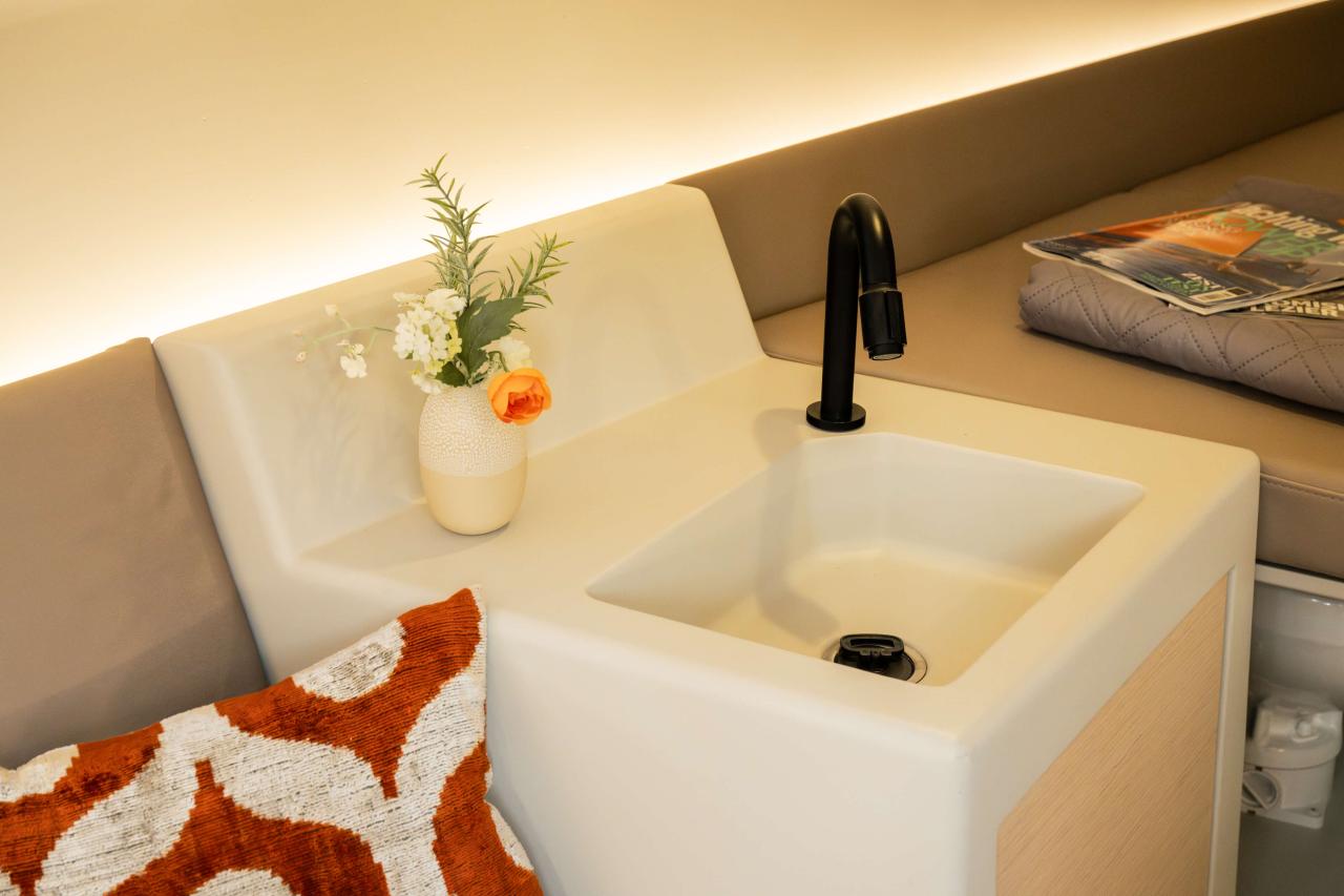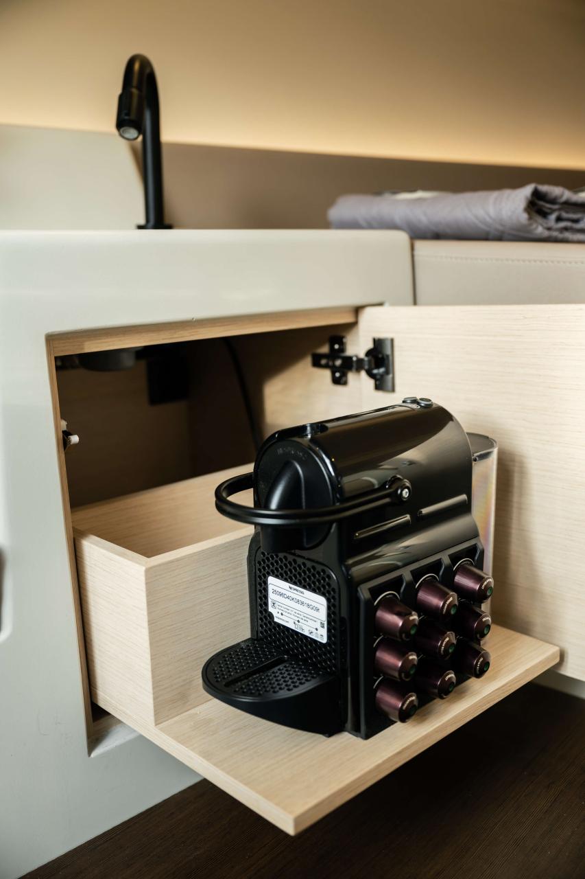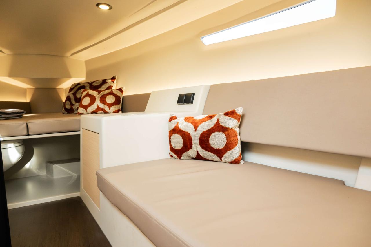 INTERIOR & COMFORT Despite its 8.40-meter hull, the SE 28 Leopard boasts an unprecedented interior volume for a daysailer. Four berths, a compact galley, and a bright living space make short stays on board ideal.