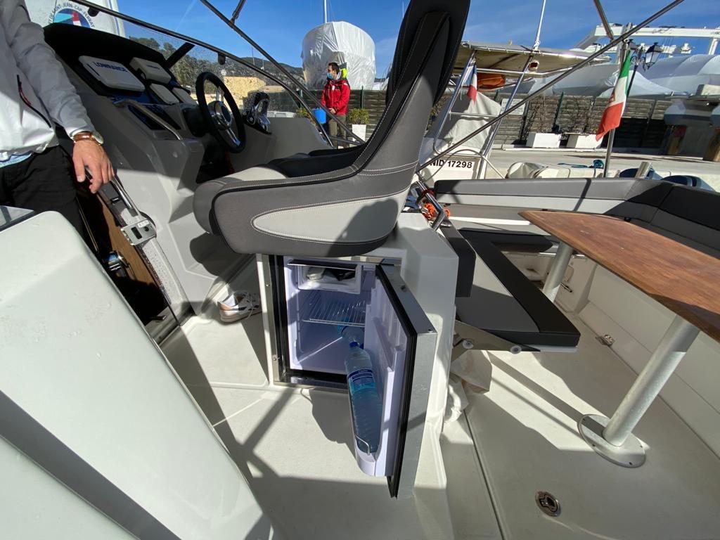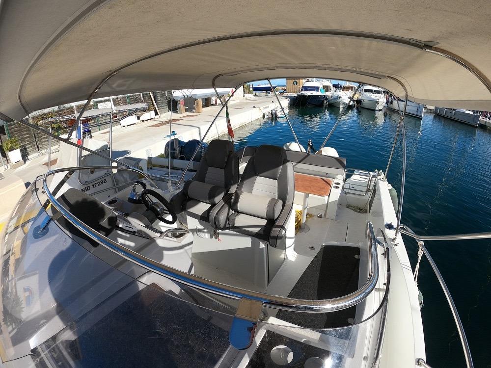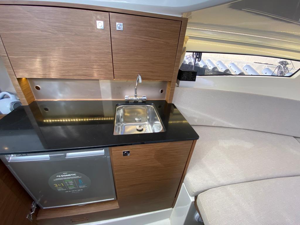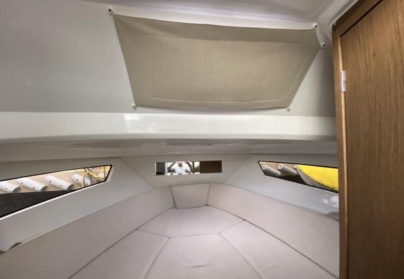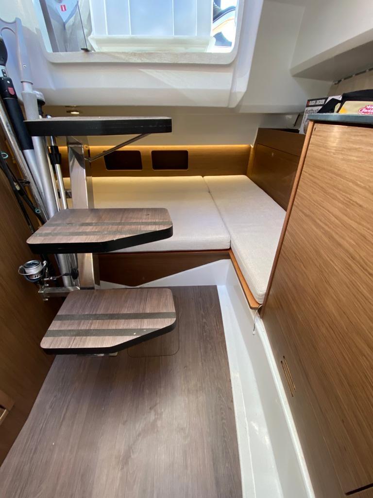The vast forward sunbathing area can comfortably accommodate several people. The central cockpit offers a modular space with U-shaped bench, removable table and numerous storage compartments. The generous aft platform with stainless steel ladder facilitates water access. The interior reveals a bright cabin with V-berth double bed, complete bathroom with toilet and shower, and equipped galley with refrigerator. Numerous portholes and panoramic sunroof flood the interior with natural light.