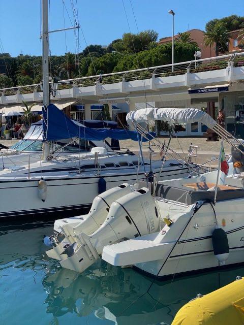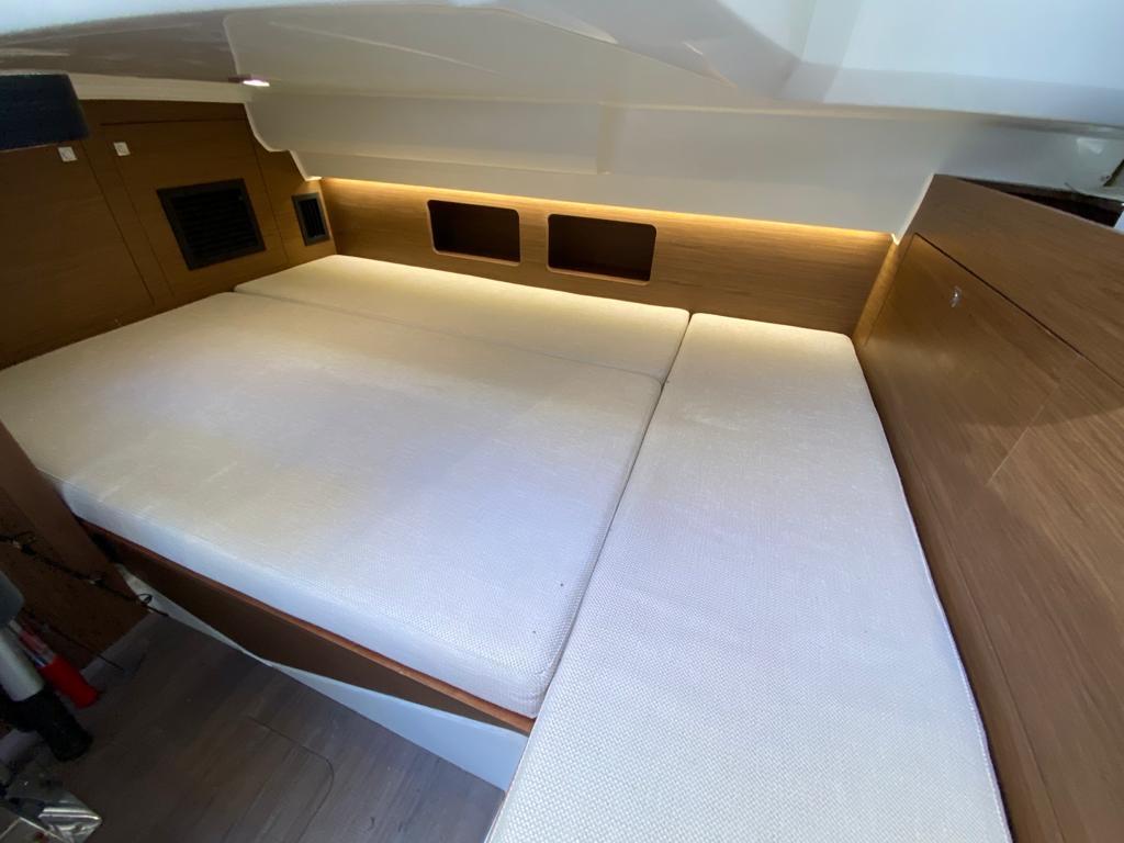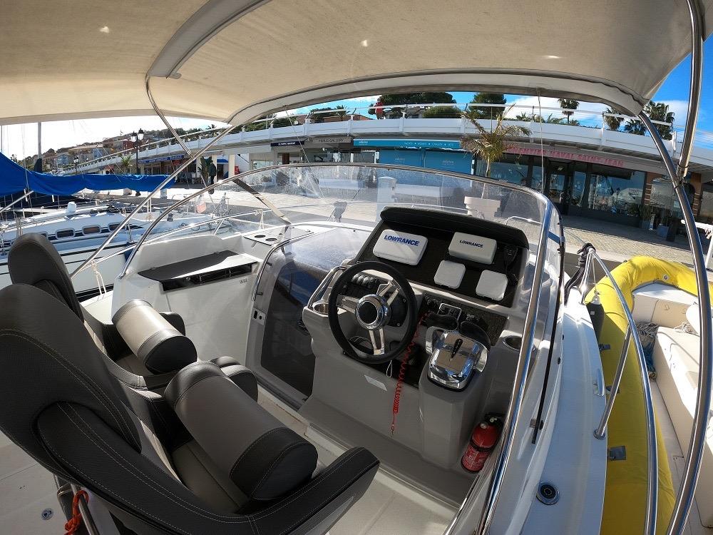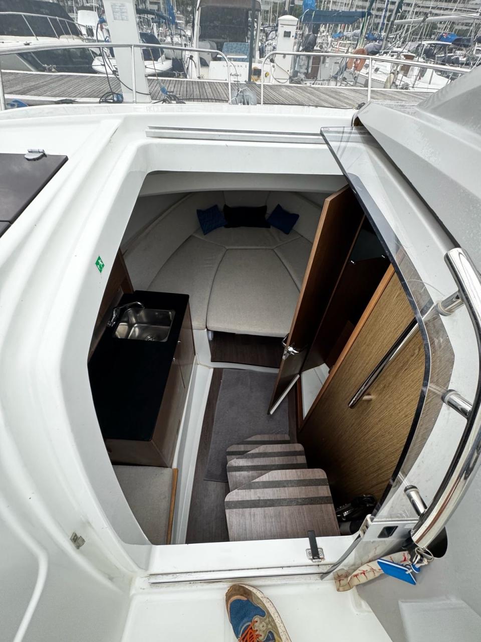 The vast forward sunbathing area can comfortably accommodate several people. The central cockpit offers a modular space with U-shaped bench, removable table and numerous storage compartments. The generous aft platform with stainless steel ladder facilitates water access. The interior reveals a bright cabin with V-berth double bed, complete bathroom with toilet and shower, and equipped galley with refrigerator. Numerous portholes and panoramic sunroof flood the interior with natural light.
