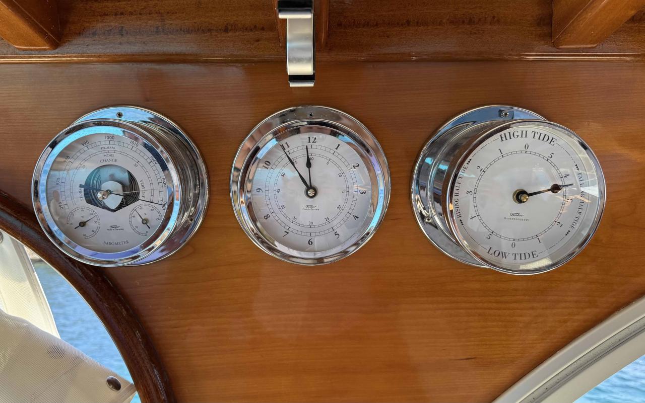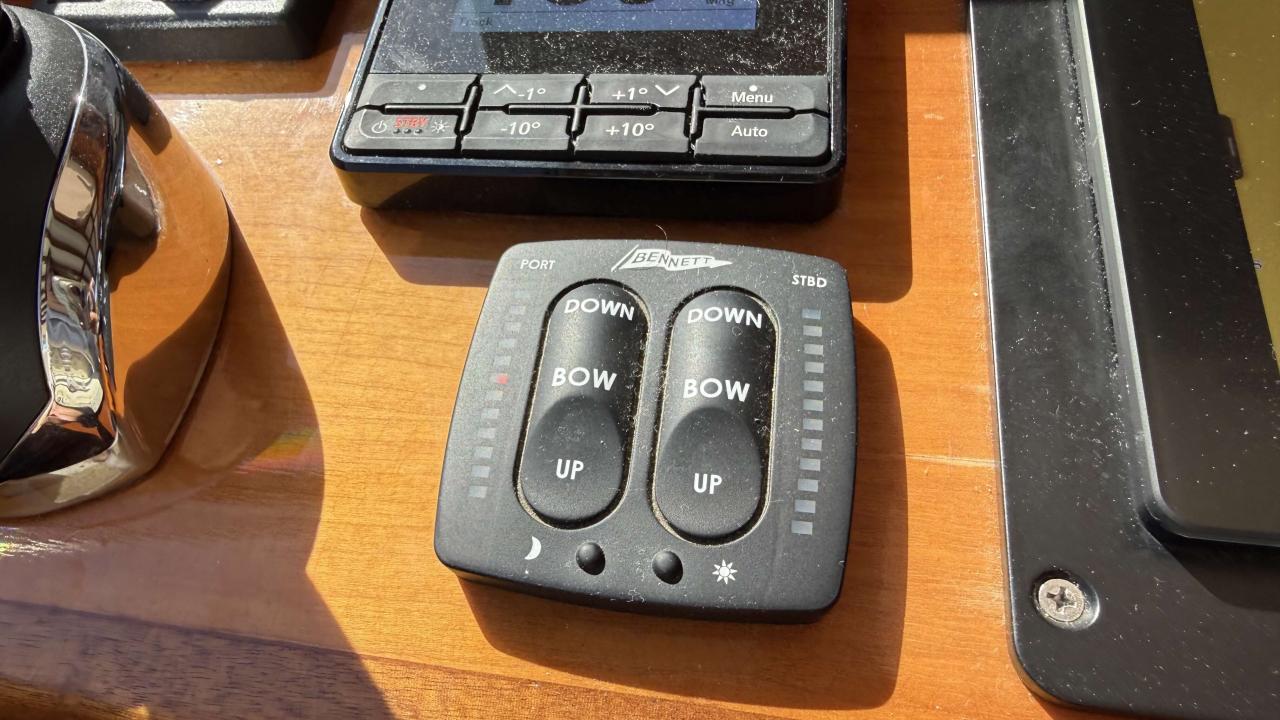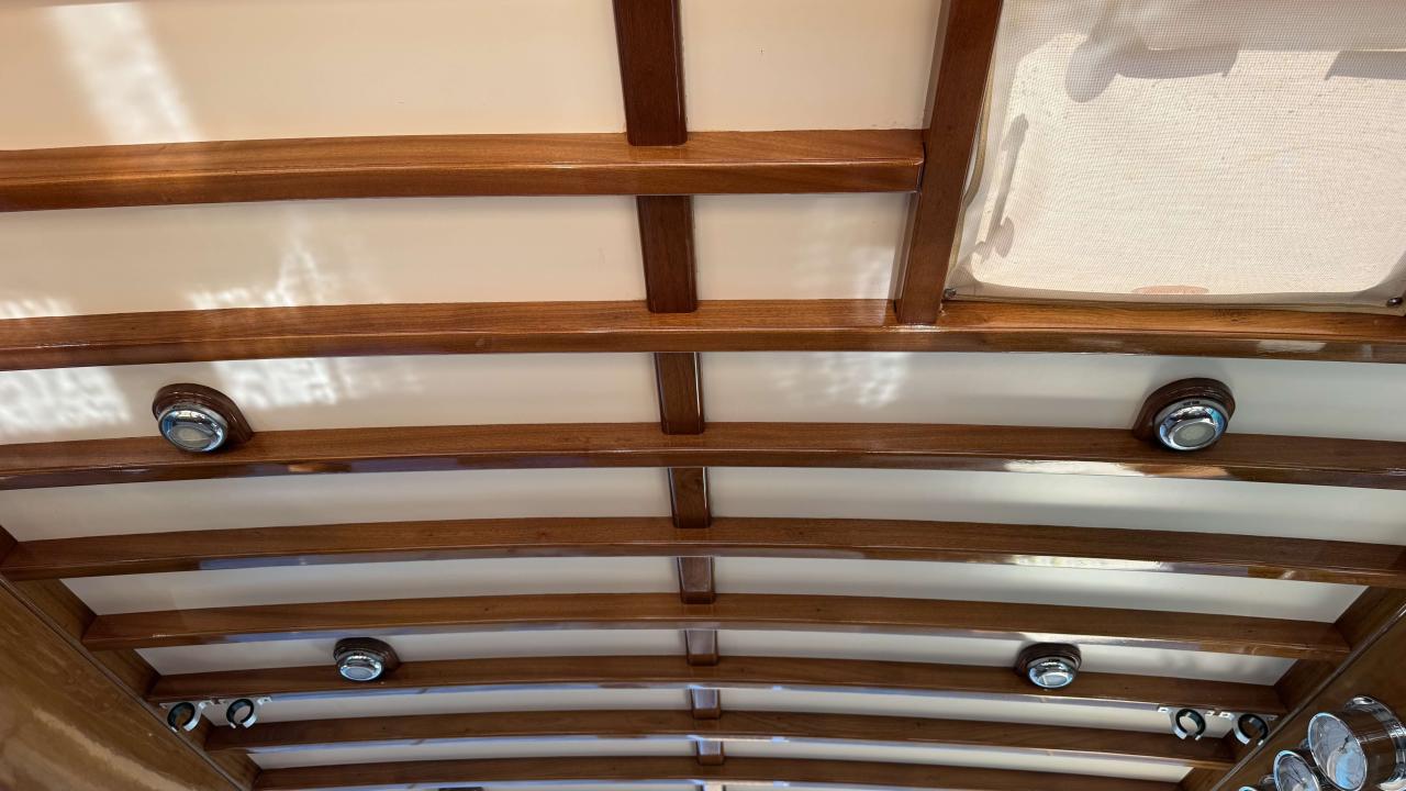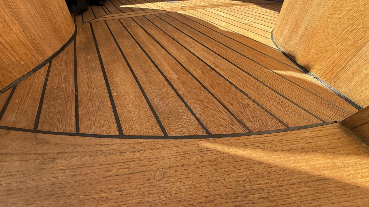 Cockpit & deck · Fully instrumented cockpit, brand new full rear bimini top, solid teak swim platform, mosquito screens, stainless steel anchor with electric windlass, mooring cleats, windshield wipers.