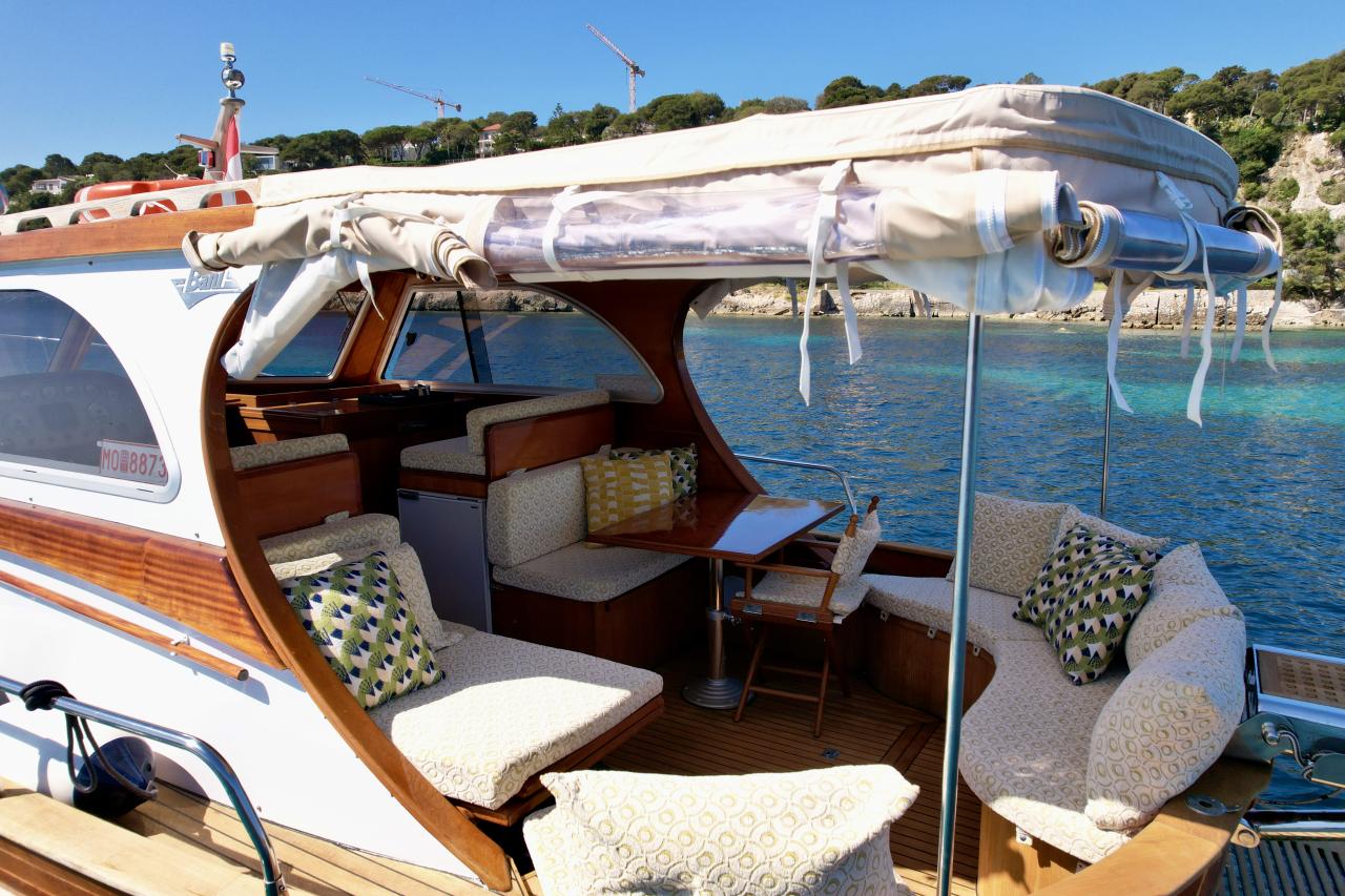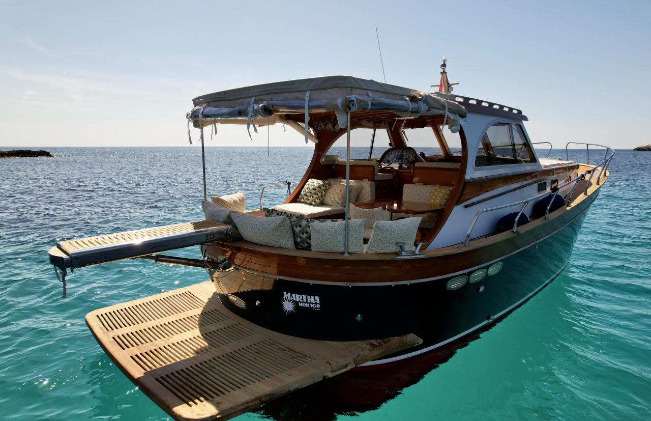 On board living · Sleeps 6, 1 bathroom, fully refurbished upholstery. Equipped outdoor galley: cooking hob, sink, refrigerator, full tableware set. Brand new custom-made mattresses, new premium custom upholstery, A/C.